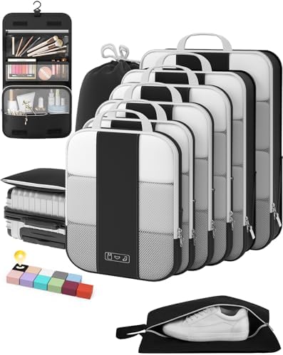 All-in-One Travel Storage Solution – Say goodbye to chaotic packing! This comprehensive set includes four compression packing cubes in varying sizes (XL, L, M, S) to accommodate everything from bulky coats to delicate tops. Plus, enjoy added convenience with a hanging toiletry bag, shoe bag, backpack-style laundry bag, and versatile pouch—all designed to keep your luggage perfectly organized and clutter-free.